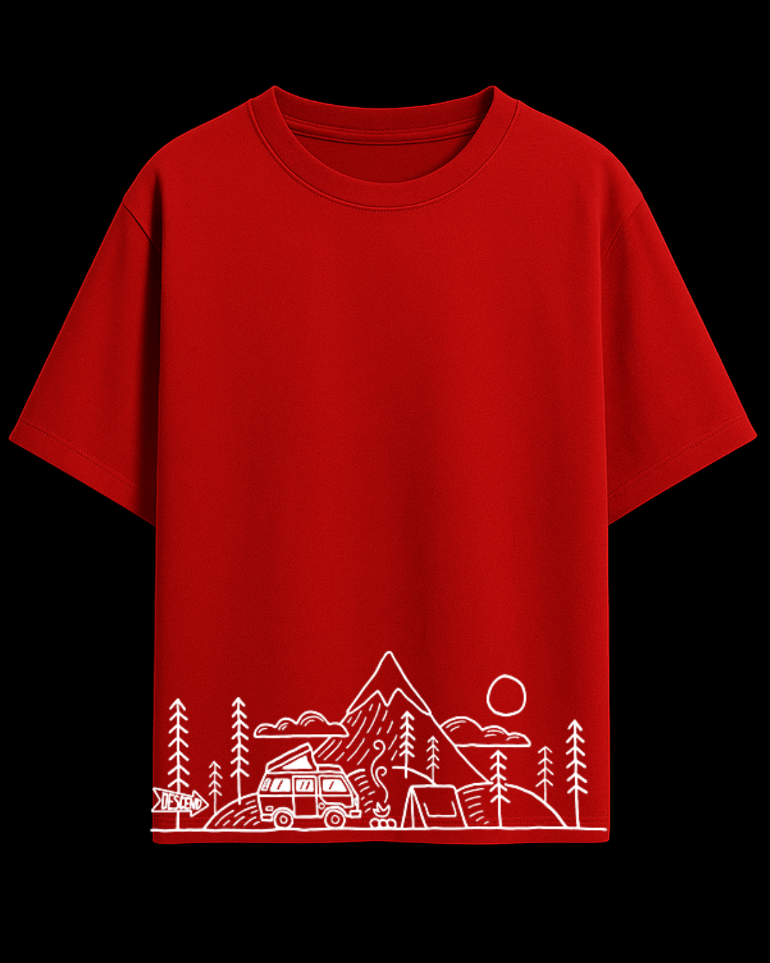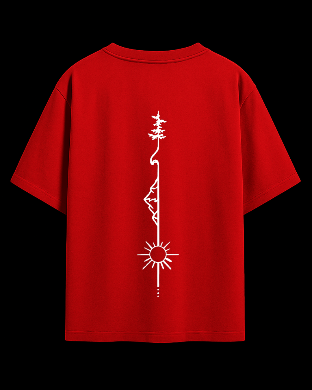 Style: Streetwear x Adventure fusion – bold red with clean white print