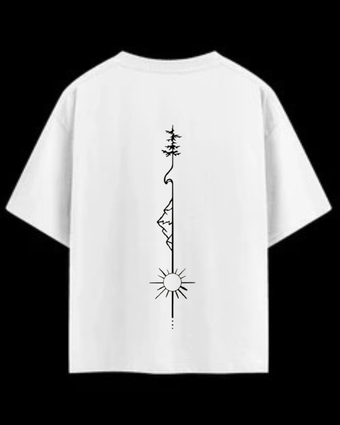 Back Design: Vertical line-art mountain, tree, and sun symbol for a bold yet minimal statement.