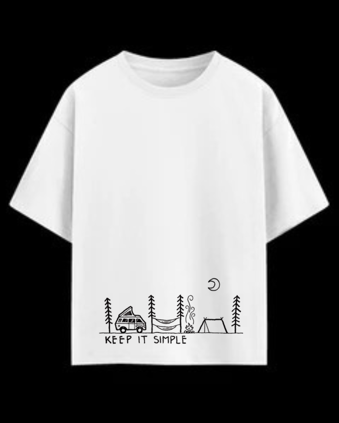 Front Design: Minimal campsite illustration with camper van, hammock, tent, trees, and the quote “Keep It Simple.”