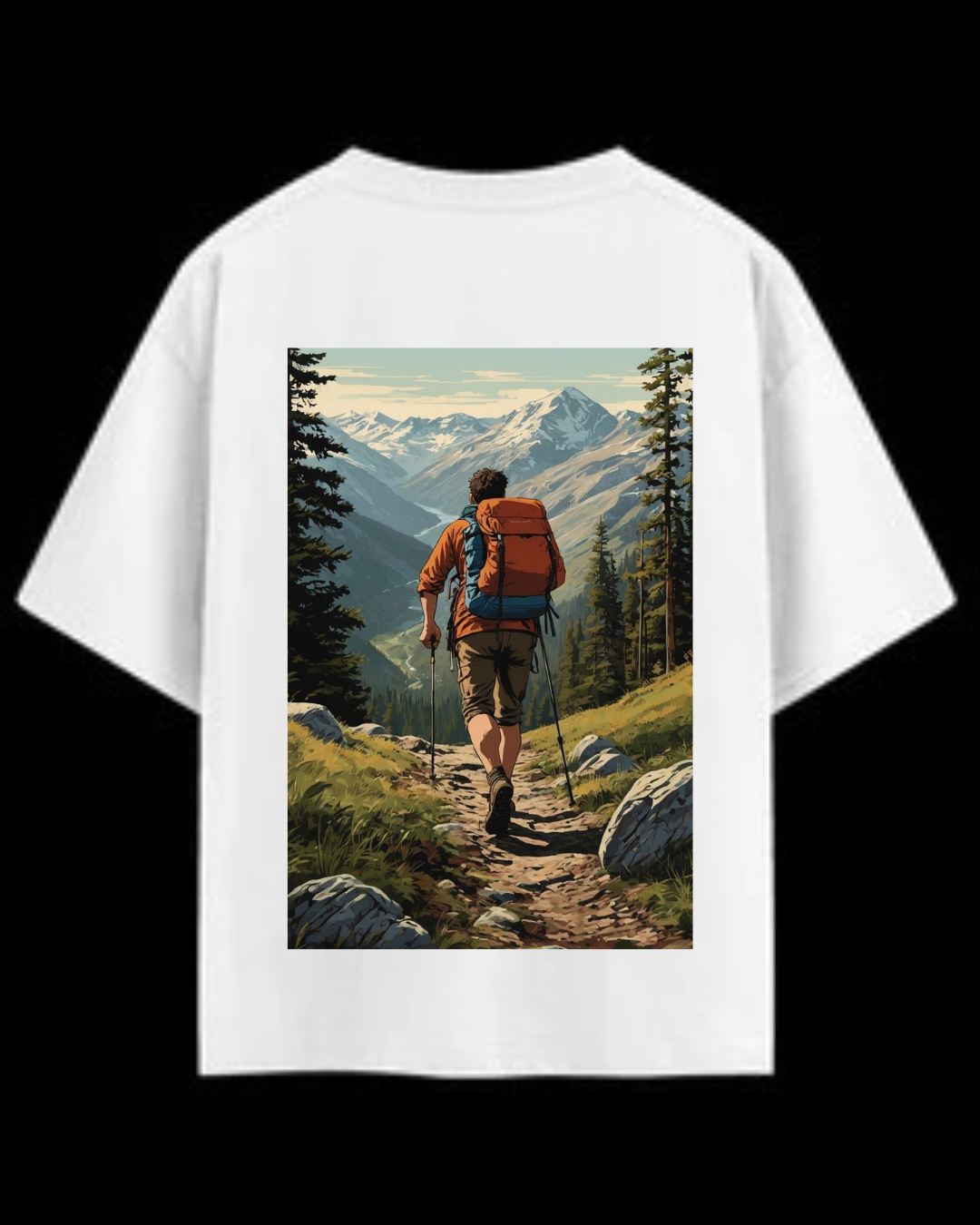 Back Design: Full-length scenic artwork of a hiker trekking through pine forests toward snow-capped mountains.