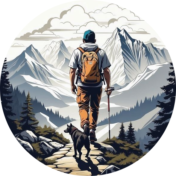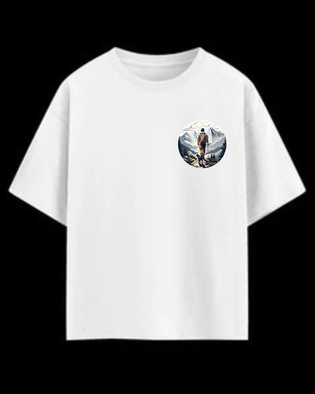 Front Design: Minimal circular chest logo with hiker silhouette & mountain peaks.